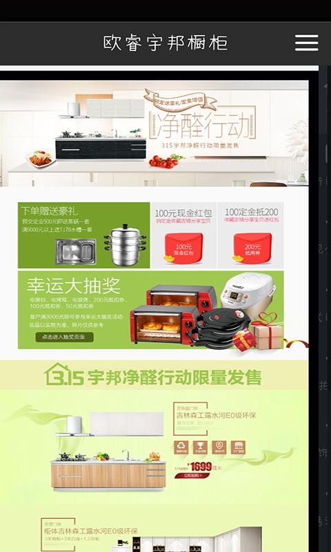 北京橱柜app是一款网络购物应用,是个欧睿宇邦橱柜线上销售、定制平台。此外在北京橱柜app中你还能参与实惠活动,了解欧睿宇邦相关资讯信息等。