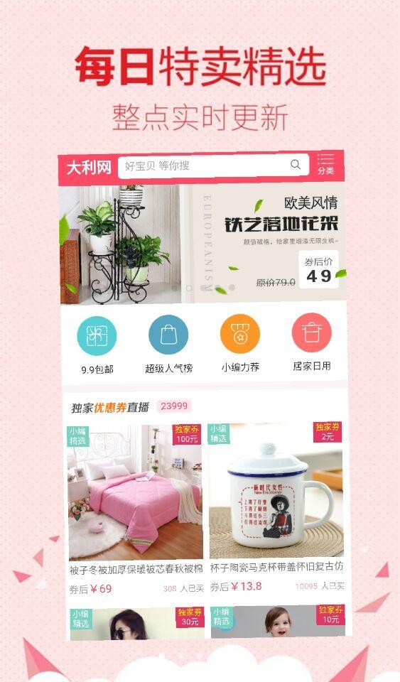 大利网app是一款网络购物应用,是个每日都更新上千款淘宝天猫内部特价商品的移动平台。大利网app,比团购秒杀还优惠,真正的为您网购省钱。