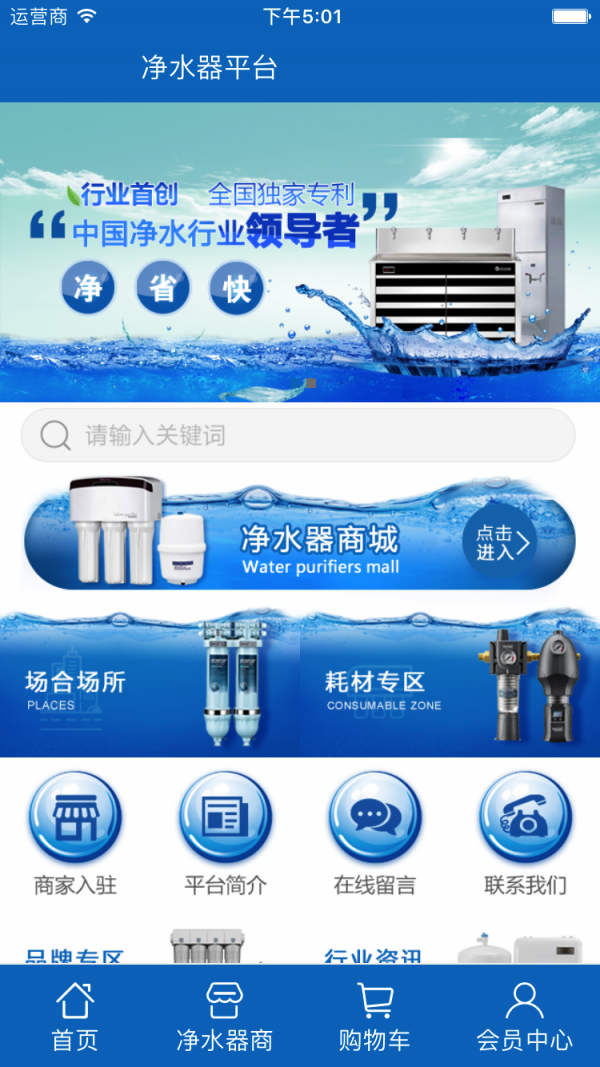 净水器平台客户端是一款实用性信息平台,集净水器商城、品牌专区、耗材选购、场合选购、行业资讯、商家入驻等功能于一体。