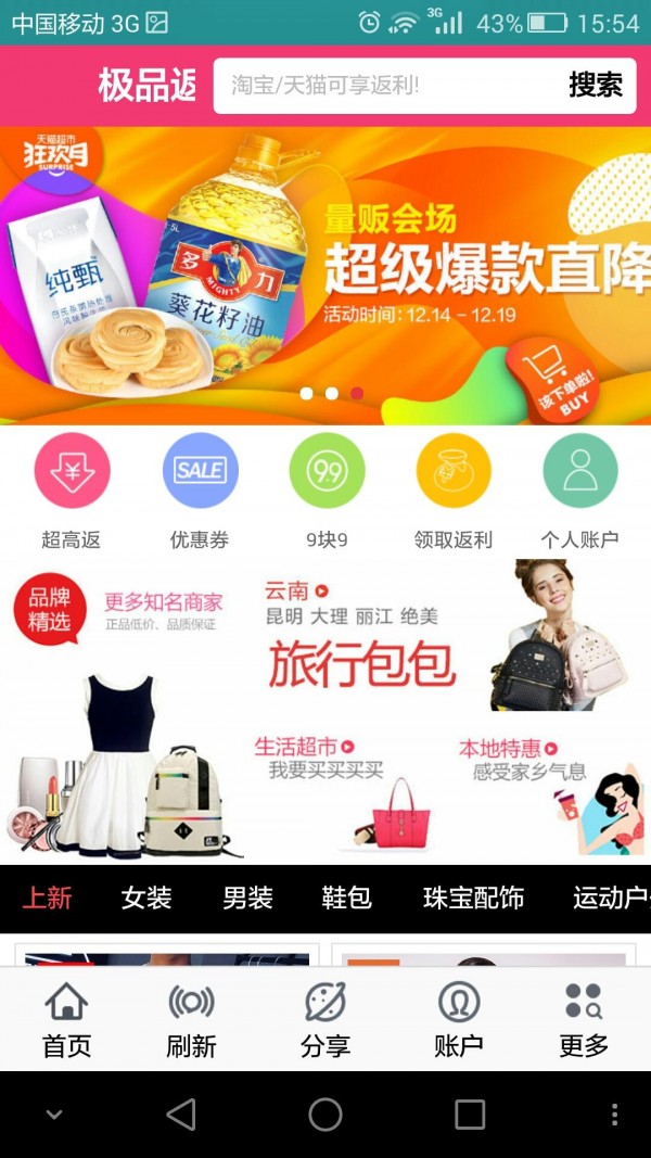 【极品返利商城】汇聚淘宝、天猫、京东、当当、亚马逊、苏宁、唯品会、聚美优品等各大电商商城。充话费、充流量、9块9、团购、好店推荐,手机购物,一个就够了!