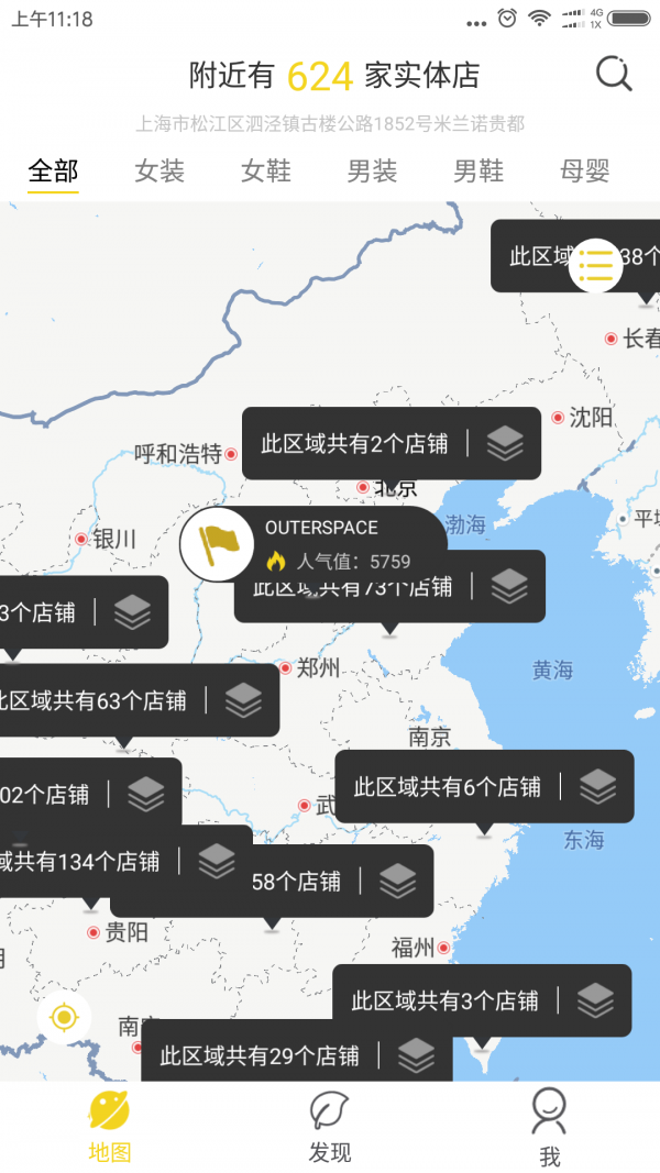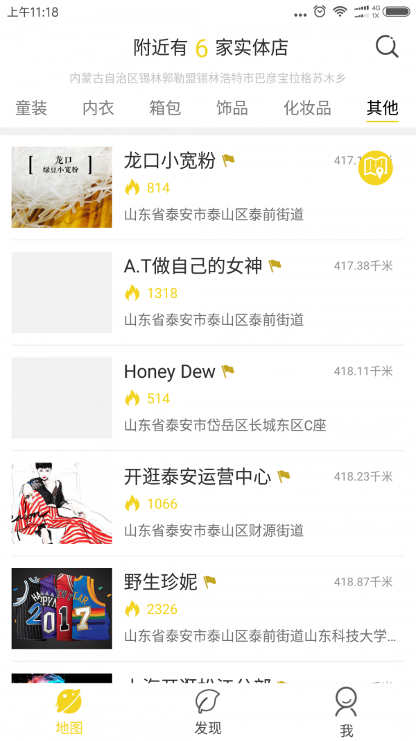 2、用户可以以任何地方为中心点,检索附近的实体店,并进行分类筛选。