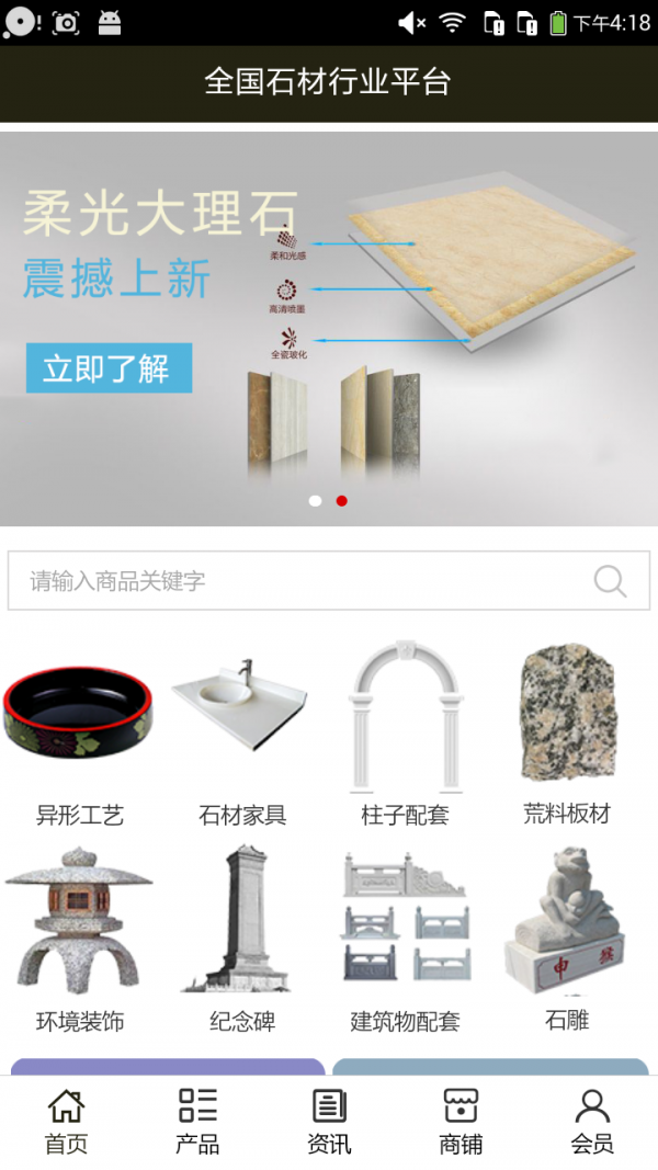 全国石材行业平台App不仅具备购物、查询订单、搜索商品、行业资讯和产品评价等常用功能,而且还实现了手机版特有的会员注册登录、广告位、招商开店等功能。目标是整合当地品牌商、生产商、经销商,为商家和消费者之间提供一站式解决案。