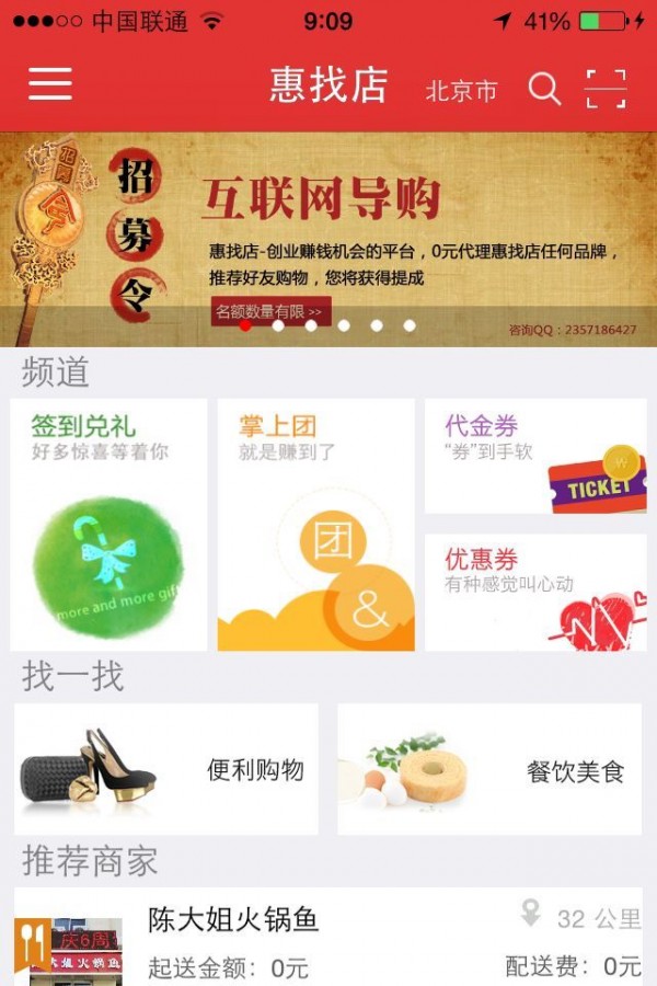 惠找店:是基于地理位置的移动营销APP平台,不仅为用户随时随地提供在线消费购物,亦提供团购等吃喝玩乐于一体以及商品价格比京东、淘宝都便宜的服务互动平台。