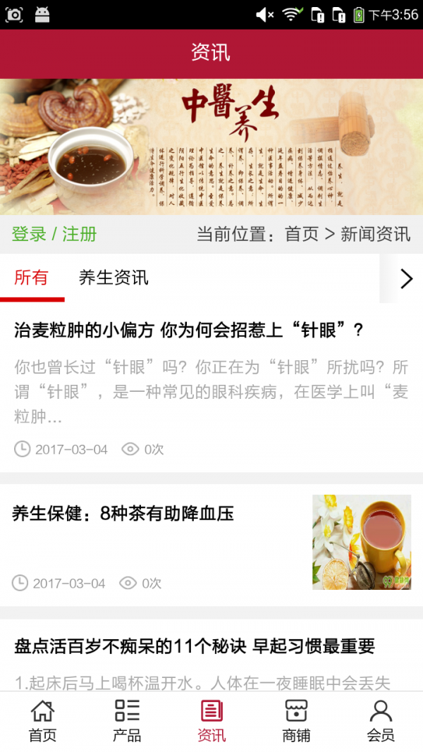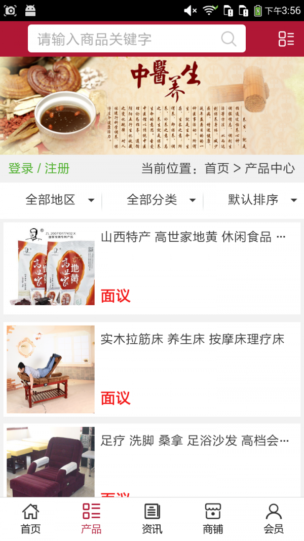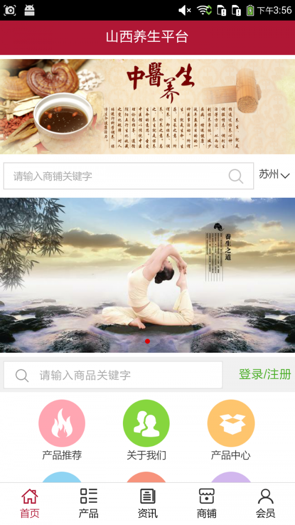山西养生平台客户端不仅具备购物、查询订单、搜索商品、行业资讯和产品评价等常用功能,而且还实现了手机版特有的会员注册登录、广告位、招商开店等功能。