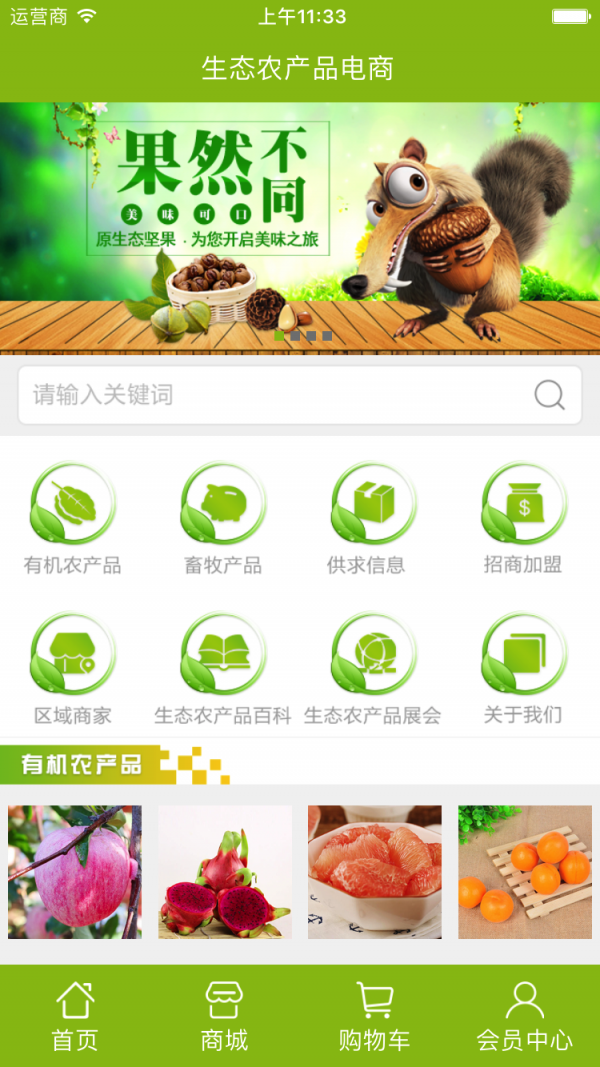 生态农产品电商客户端是一款实用性信息平台,集有机农产品、畜牧产品、供求信息、招商加盟、区域商家、生态农产品百科、生态农产品展会等功能于一体。