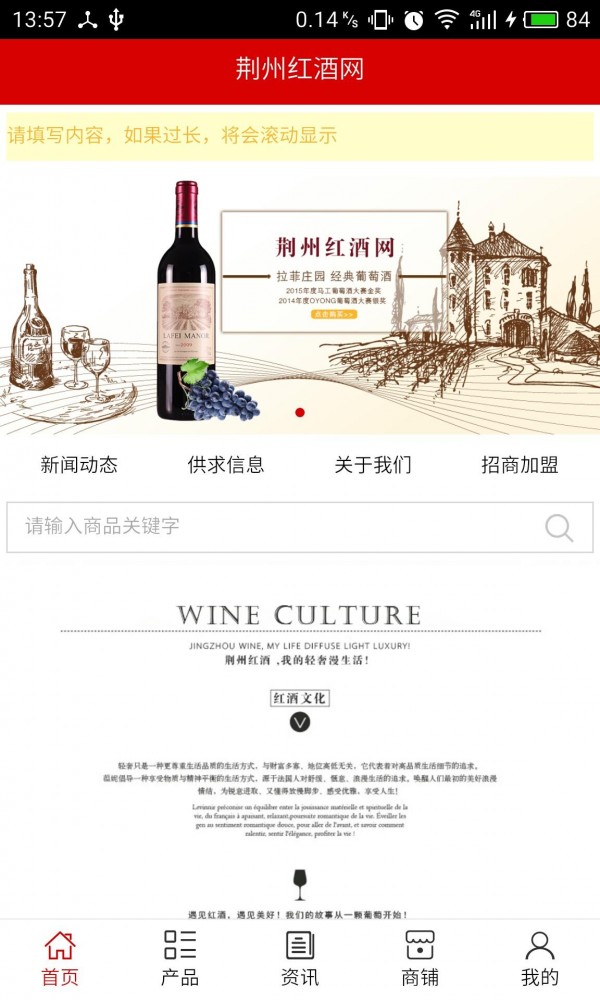 荆州红酒网APP客户端不仅具备购物、查询订单、搜索商品、行业资讯和产品评价等常用功能,而且还实现了手机版特有的会员注册登录、广告位、招商开店等功能。