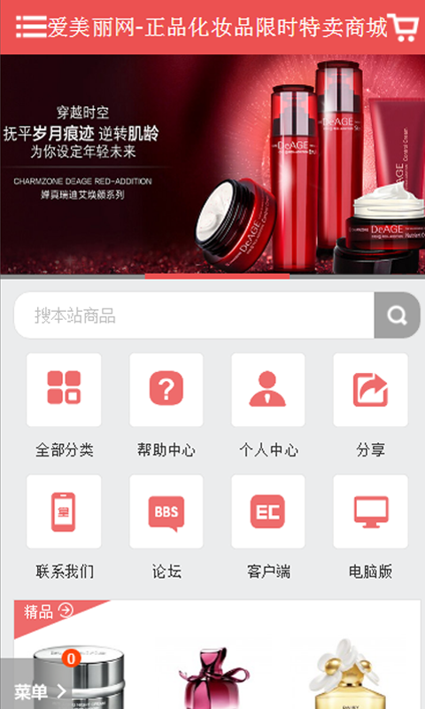 爱美丽网-一家专门做化妆品特卖移动应用商城!每天超低价化妆品、护肤品、香水、彩妆、美体瘦身等时尚妆品信息,网站主要销售欧美及日韩一线品牌化妆品。以服饰,美容,化妆,发型,减肥,健康,情感,生活,星座,TAGS,图库,视频,论坛,专题 ,商城等15大主打栏目,爱美丽网秉承“关注女性,打造女人自信、美丽、优雅”的理念.