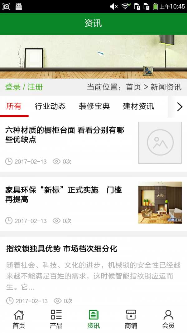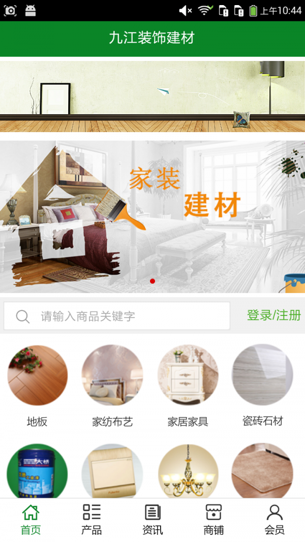 九江装饰建材客户端不仅具备购物、查询订单、搜索商品、行业资讯和产品评价等常用功能,而且还实现了手机版特有的会员注册登录、广告位、招商开店等功能。