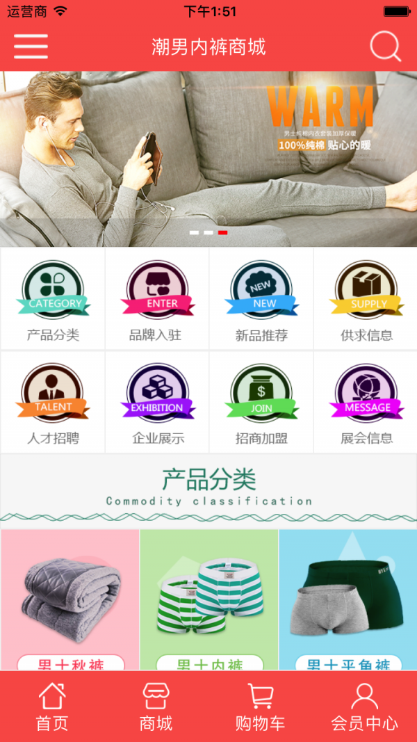 潮男内裤商城是一款简单实用的客户端信息平台。潮男内裤商城客户端是一个集产品分类、品牌入驻、新品推荐、供求信息、人才招聘、企业展示、招商加盟、展会信息、男士内裤、男士秋裤、男士平角裤、男士三角裤、男士背心、男士秋衣套装等信息发布的一个集成平台。同时,为方便用户下载安装,还提供二维码、分享等功能,为广大客户展示一个丰富多样的信息平台。