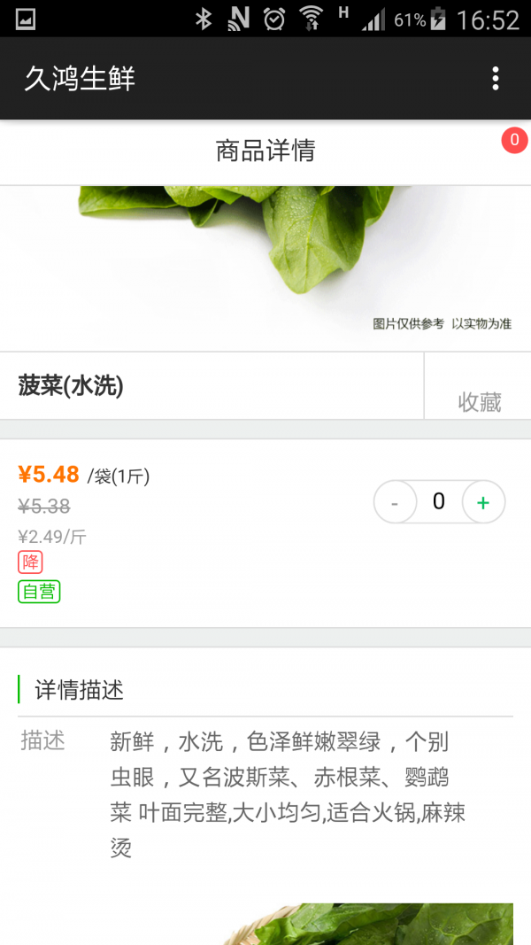 久鸿生鲜,客户选择菜品的一个方便途径,通过选择相应的产品,就能享受到货物直接送到家的便捷!通过此应用,您可以随时了解当前市场菜价和菜的品种,是您生活的好帮手!