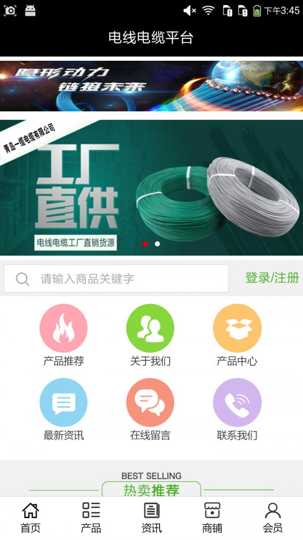 电线电缆平台app不仅具备购物、查询订单、搜索商品、行业资讯和产品评价等常用功能,而且还实现了手机版特有的会员注册登录、广告位、招商开店等功能。目标是整合当地品牌商、生产商、经销商,为商家和消费者之间提供一站式解决案。欢迎下载使用!