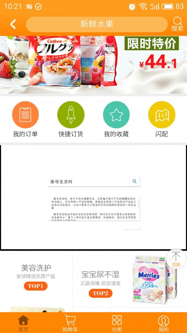 康导优淘app是一款网络购物应用,有了康导优淘app,用户在家也能购买各种零食以及其他需要的生活用品,购物就是这么简单。