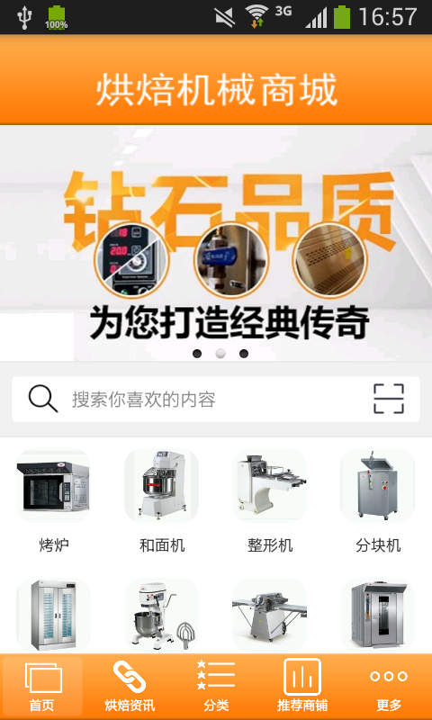 还是一个专门销售烘焙机械产品的商城平台,这里有齐全、优质、实惠的产品,烤炉、和面机、整形机、分块机、醒发机、打蛋机、起酥机等产品,在手机上点击几下,即可收入囊中,方便快捷。