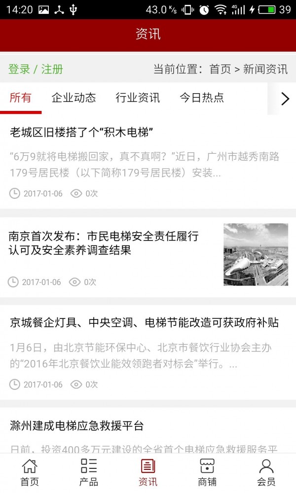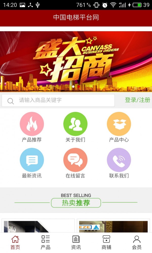 电梯平台网app不仅具备购物、查询订单、搜索商品、行业资讯和产品评价等常用功能,而且还实现了手机版特有的会员注册陆、广告位、招商开店等功能。