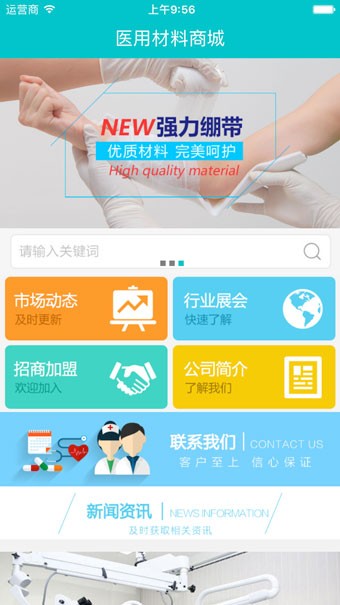 医用材料商城客户端主要以医用材料行业服务为主,提供市场动态、行业展会、招商加盟、公司简介、产品中心及联系我们等信息,致力于打造国人医用材料行业最专业、最权威、为用户着想的公共服务平台。欢迎广大用户下载使用!