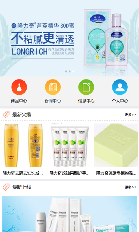 安徽隆力奇是一款关于隆力奇产品的移动手机APP客户端,它包含了重大活动、市场锦集、企业会员、供应信息、秀发洗护、护手霜、香皂等商品信息和资讯,快来下载安徽隆力奇APP体验吧!