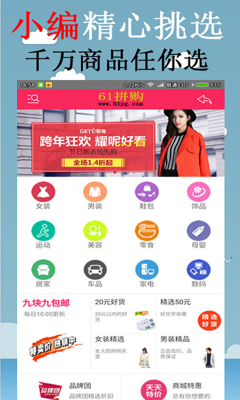 61拼够app精挑细选各大电商品质宝贝,天天都有定时免单,签到送现金,9.9包邮,20元好货,高额优惠券,女装,男装,数码,家居,等等...应有尽有,app内所有宝贝均为工作人员一个一个试来,谈来,优惠力度非常大,拥有千万级别的用户是我们不断努力的成果,聆听每一位用户的想法和意见不断改进产品特色,只为用户做到精益求精。这里聚集了上百万的粉丝,为了更多的超值和省钱,相信他们的选择。