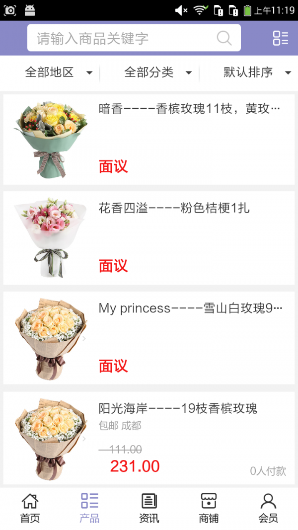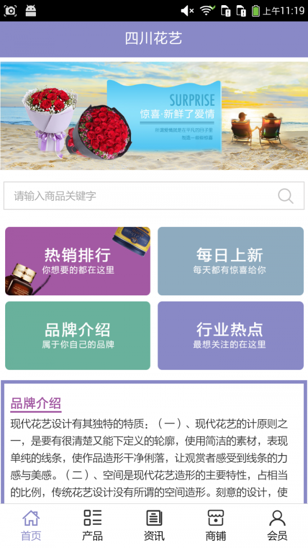 四川花艺客户端不仅具备购物、查询订单、搜索商品、行业资讯和产品评价等常用功能,而且还实现了手机版特有的会员注册登录、广告位、招商开店等功能。
