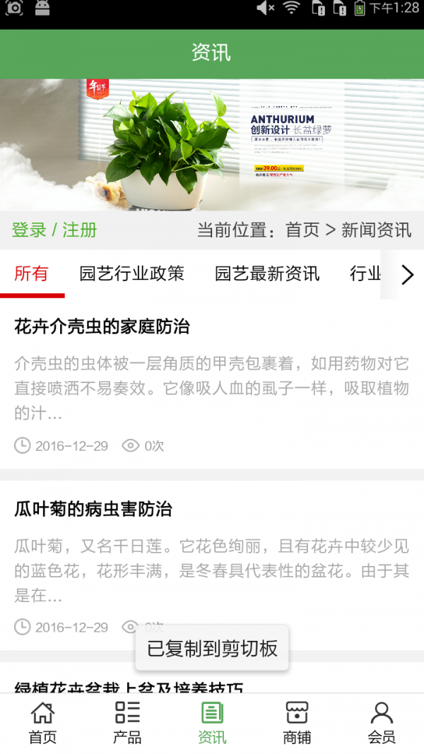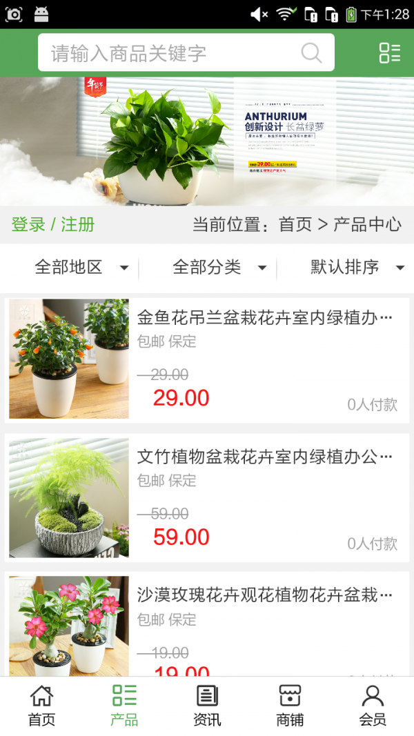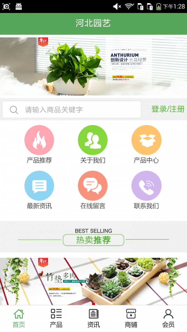 河北园艺客户端不仅具备购物、查询订单、搜索商品、行业资讯和产品评价等常用功能,而且还实现了手机版特有的会员注册登录、广告位、招商开店等功能。