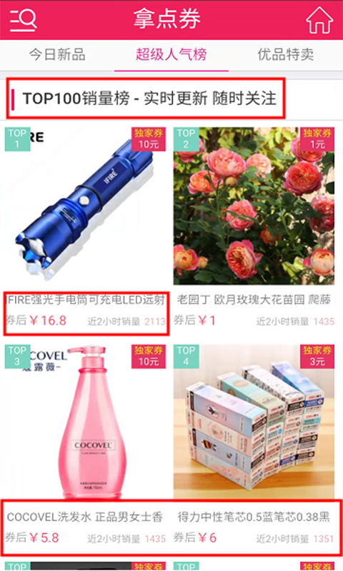 2:超人气榜-top100销量榜 实时更新,随时关注和展示当前两小时的爆款,看看大家都买了一些什么有了大家的认可,买的东西更加放心!