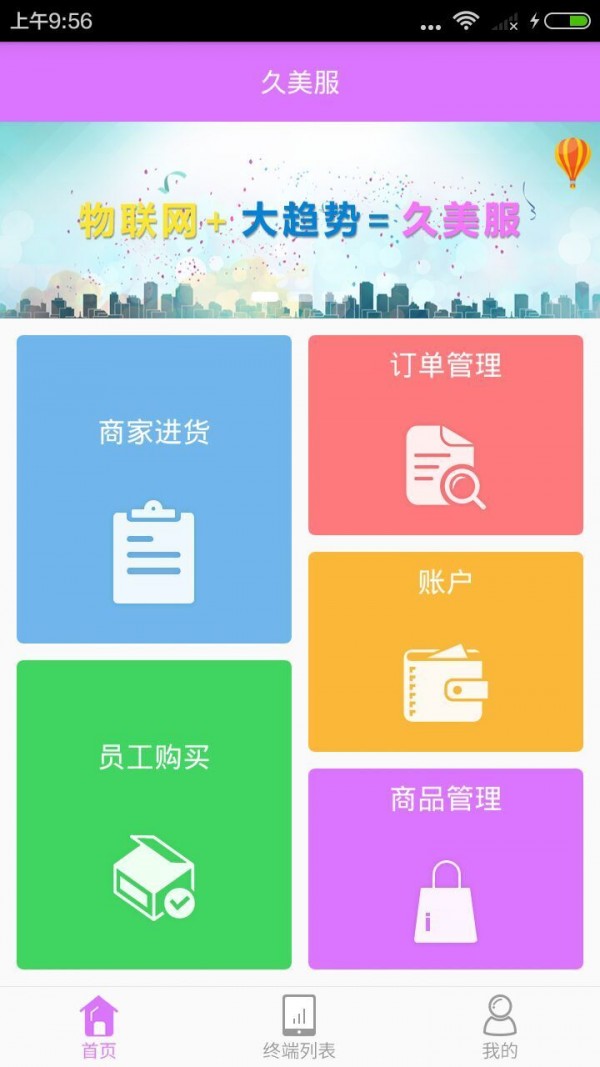 当前版本为初始版本,主要功能有下单拿货,终端管理及账户管理等,面向用户为久美服商家及其下的终端用户,可以说是终端的手机app版。