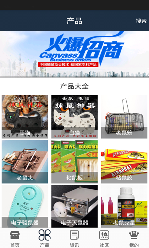 捕鼠app是一款网络购物应用,是个整合传统行业移动电商一站式服务互动体验平台。通过捕鼠app你可查阅产品信息,了解行业资讯和捕鼠技巧,以及在线购买产品等。