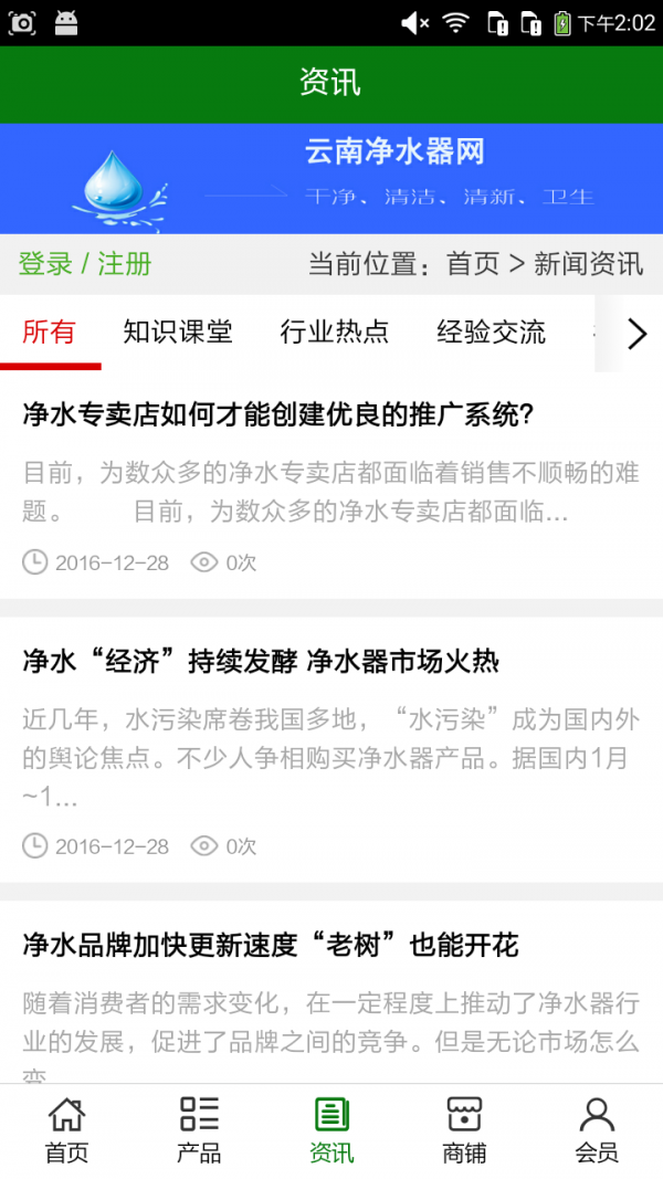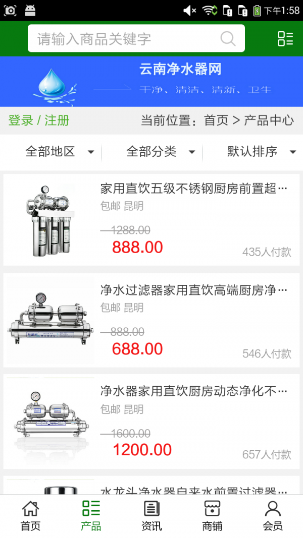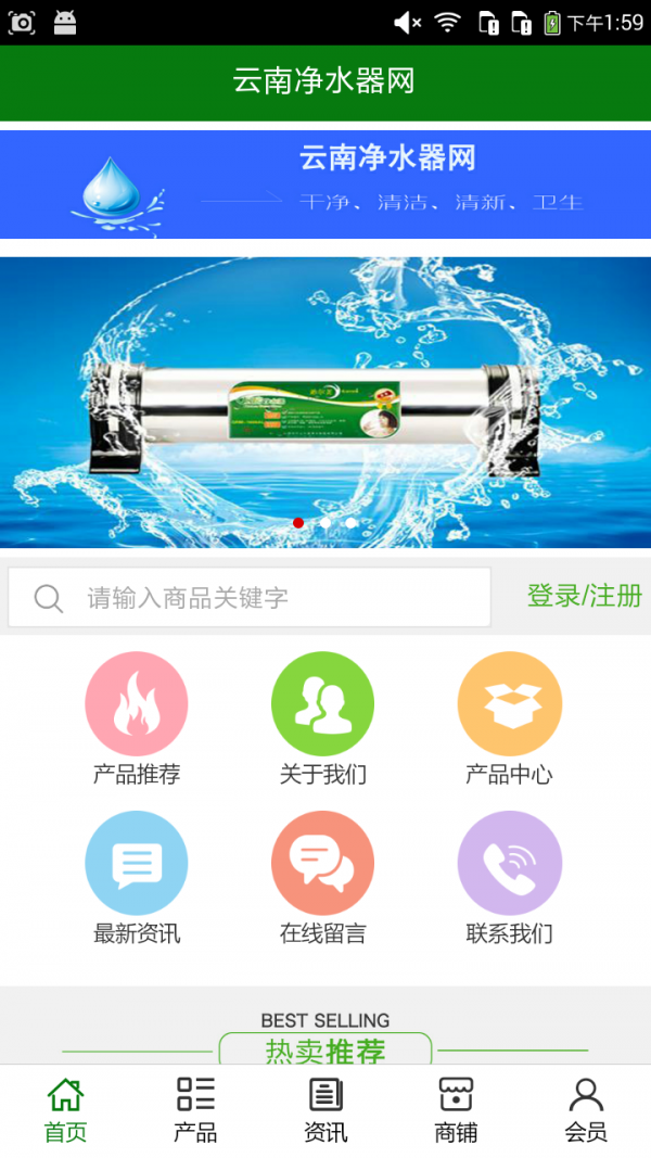 云南净水器网APP不仅具备购物、查询订单、搜索商品、行业资讯和产品评价等常用功能,而且还实现了手机版特有的会员注册登录、广告位、招商开店等功能。目标是整合当地品牌商、生产商、经销商,为商家和消费者之间提供一站式解决案。