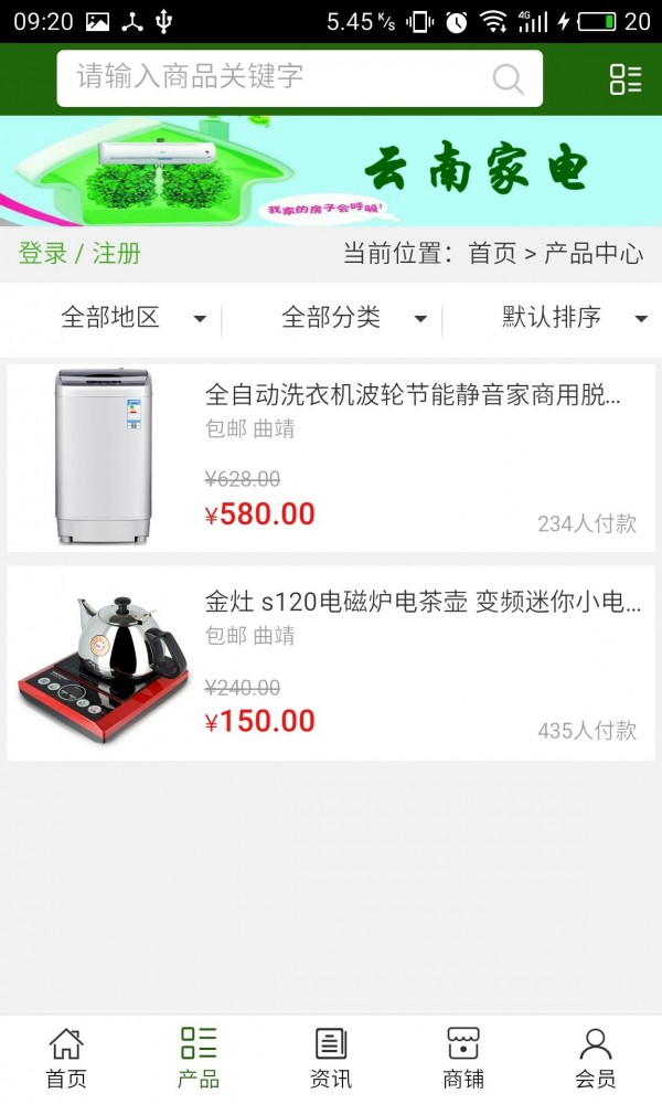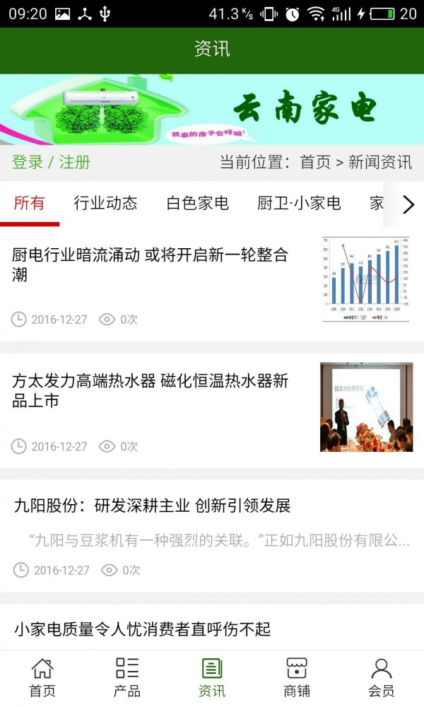 云南家电客户端不仅具备购物、查询订单、搜索商品、行业资讯和产品评价等常用功能,而且还实现了手机版特有的会员注册陆、广告位、招商开店等功能。