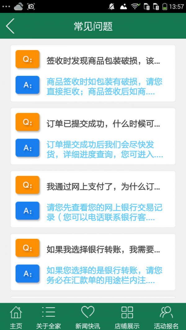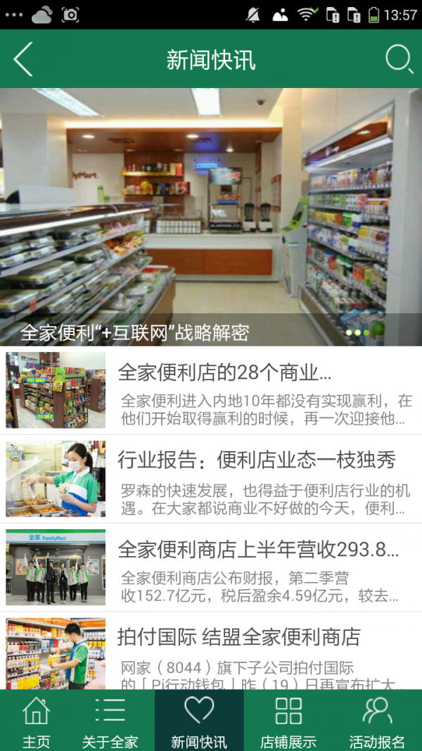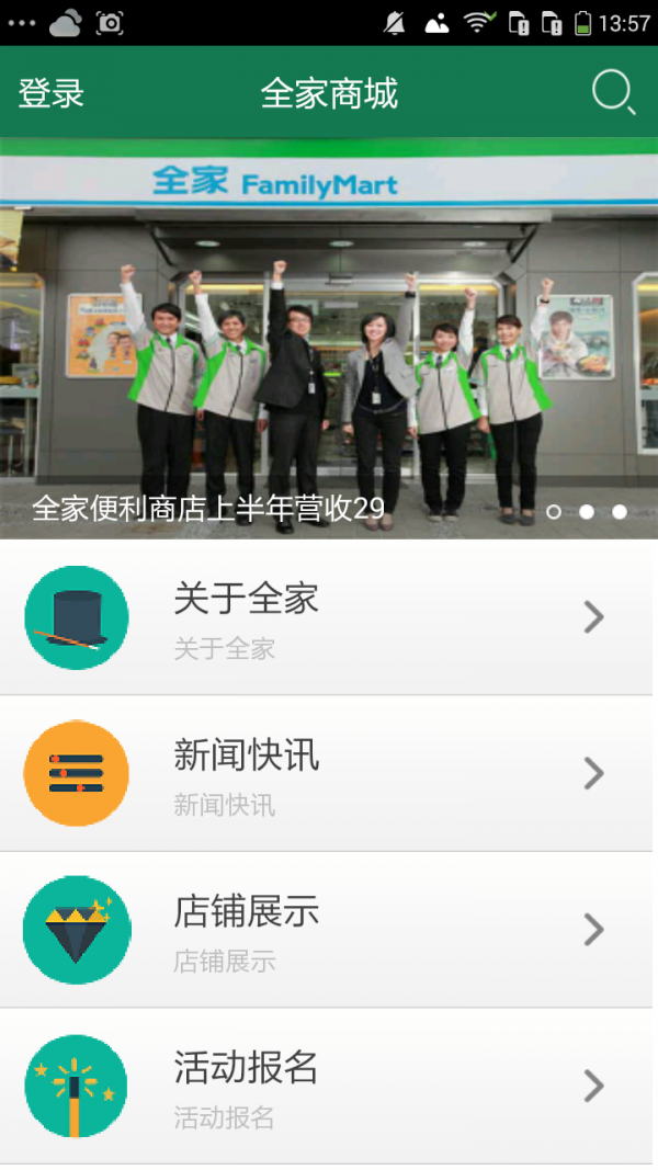 全家商城app包含:行业资讯,关于我们,互动分享,优惠服务,我的收藏,个人中心,地图导航,常见问题,店铺展示,活动报名等内容!欢迎您的下载!