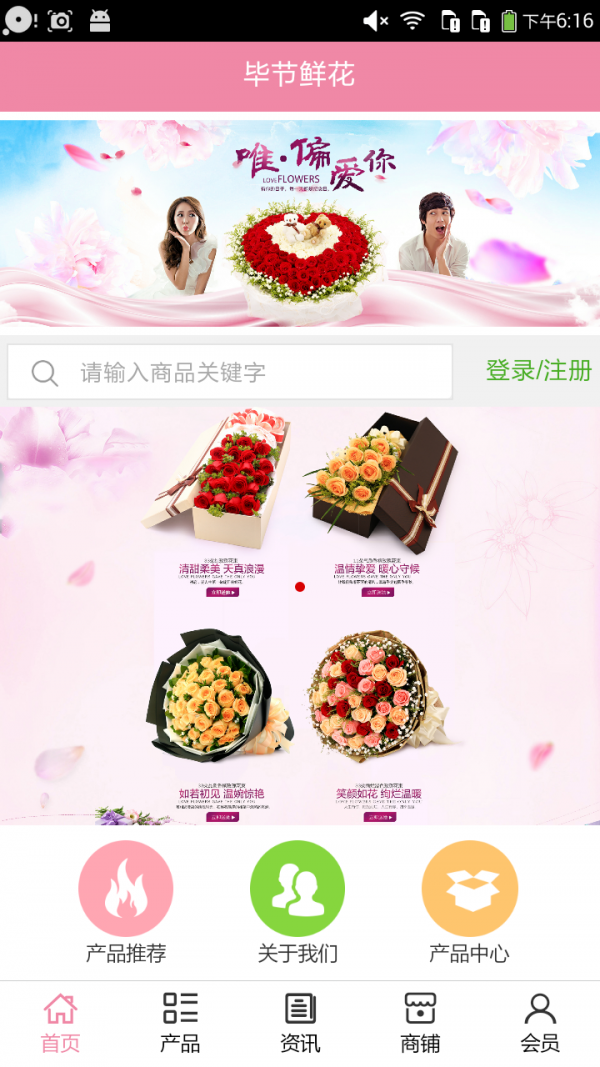 毕节鲜花客户端不仅具备购物、查询订单、搜索商品、行业资讯和产品评价等常用功能,而且还实现了手机版特有的会员注册登录、广告位、招商开店等功能。目标是整合当地品牌商、生产商、经销商,为商家和消费者之间提供一站式解决案。