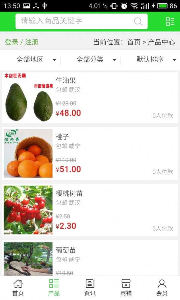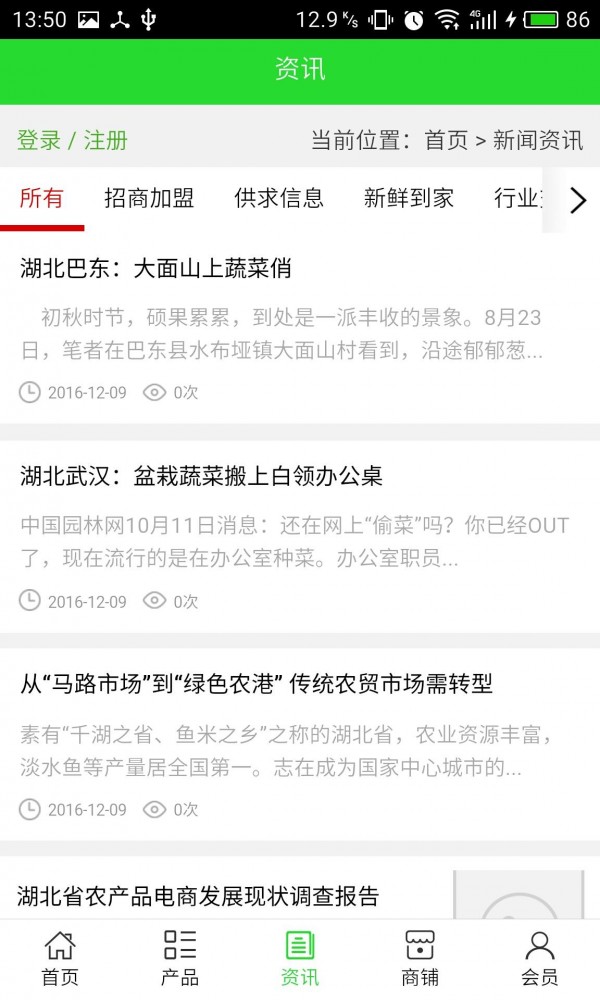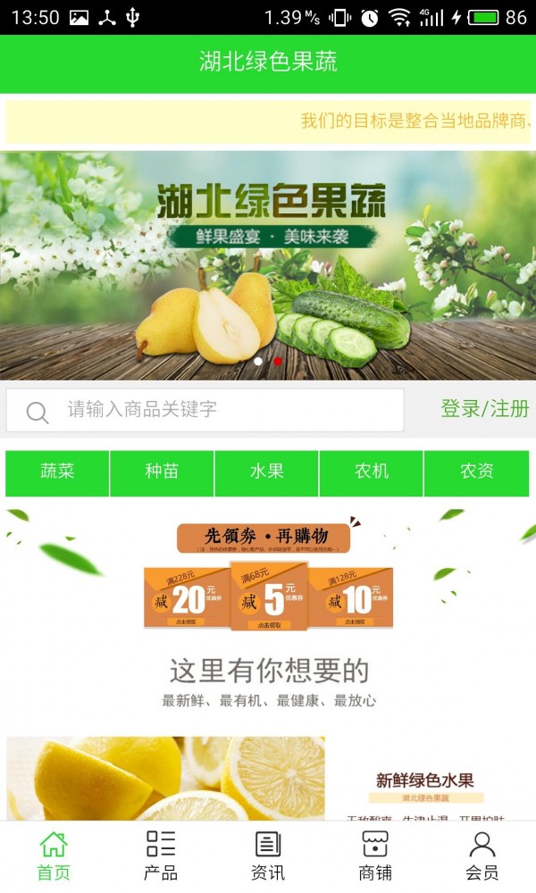 湖北绿色果蔬APP客户端不仅具备购物、查询订单、搜索商品、行业资讯和产品评价等常用功能,而且还实现了手机版特有的会员注册登陆、广告位、招商开店等功能。