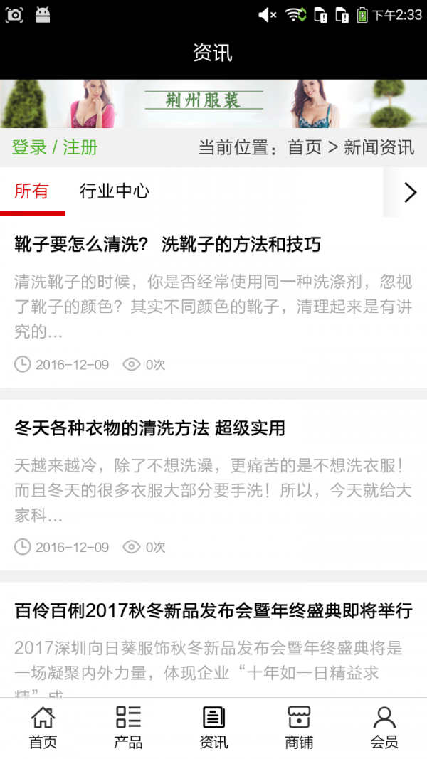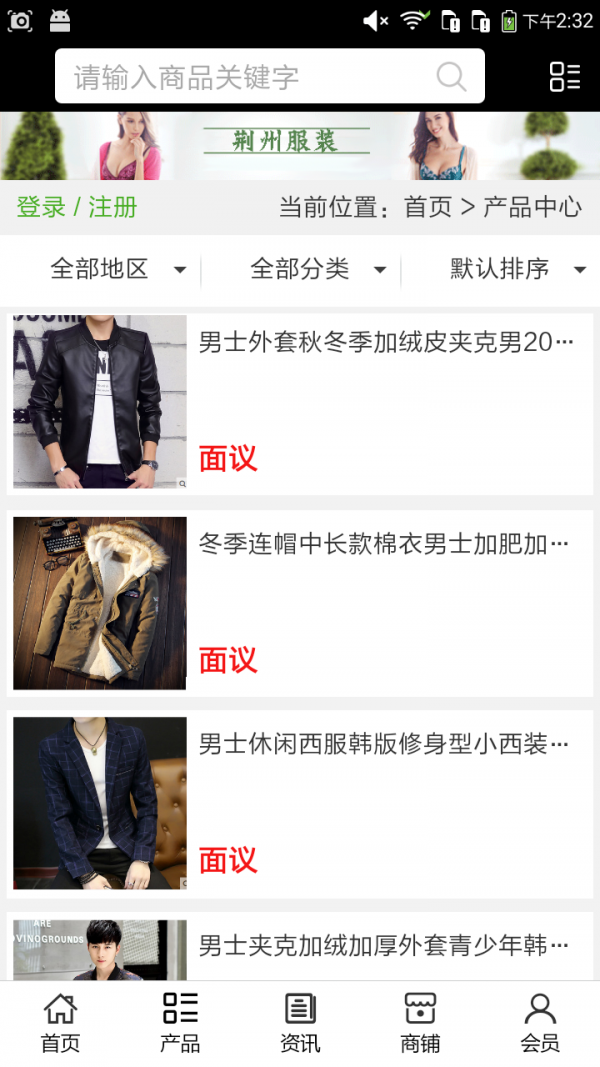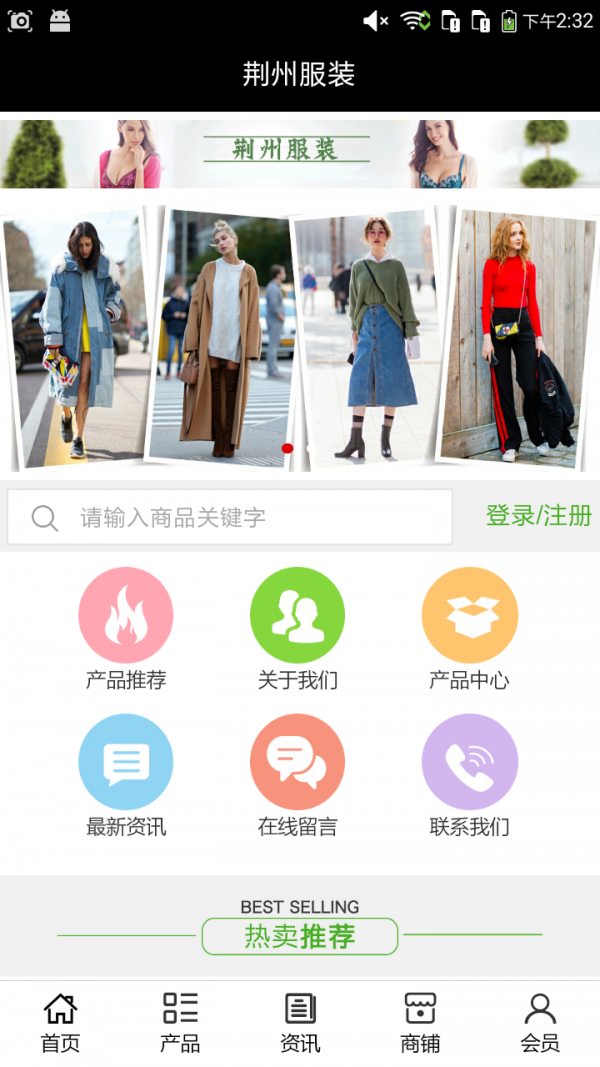 荆州服装app不仅具备购物、查询订单、搜索商品、行业资讯和产品评价等常用功能,而且还实现了手机版特有的会员注册登录、广告位、招商开店等功能。