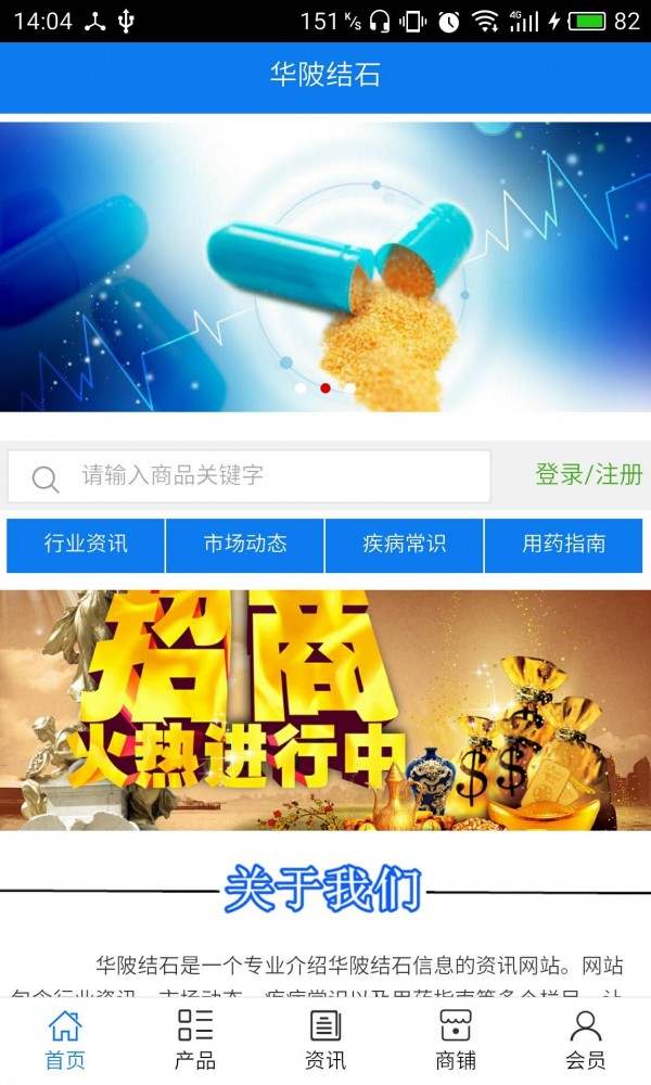 华陂结石app具备搜索信息、行业资讯和产品信息等常用功能,而且还实现了手机版特有的会员注册陆、广告位、招商开店等功能。