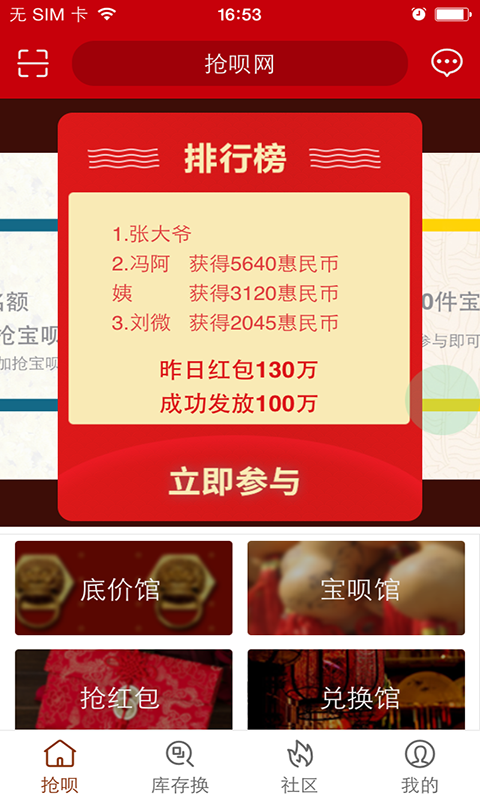 抢红包:让你随时随地不限时间的去抢红包,赠积分(惠民币),想上就上抢呗红包 ,想抢红包就上抢呗,体验逛商城、购物都有满满的红包超值大收益!