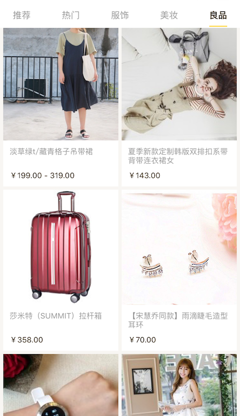 3、包含推荐、热门、服饰、美妆、良品五个栏目