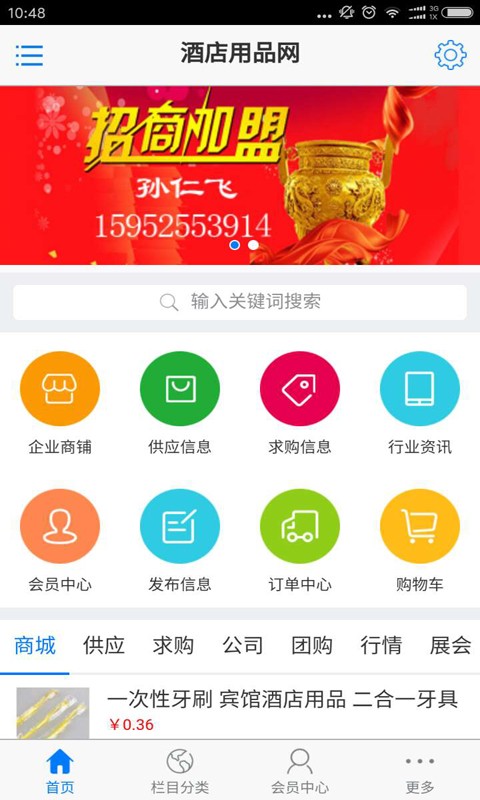 酒店用品网客户端不仅具备购物、查询订单、搜索商品、行业资讯和产品评价等常用功能,而且还实现了手机版特有的会员注册登录、广告位、招商开店等功能。目标是整合当地品牌商、生产商、经销商,为商家和消费者之间提供一站式解决案。