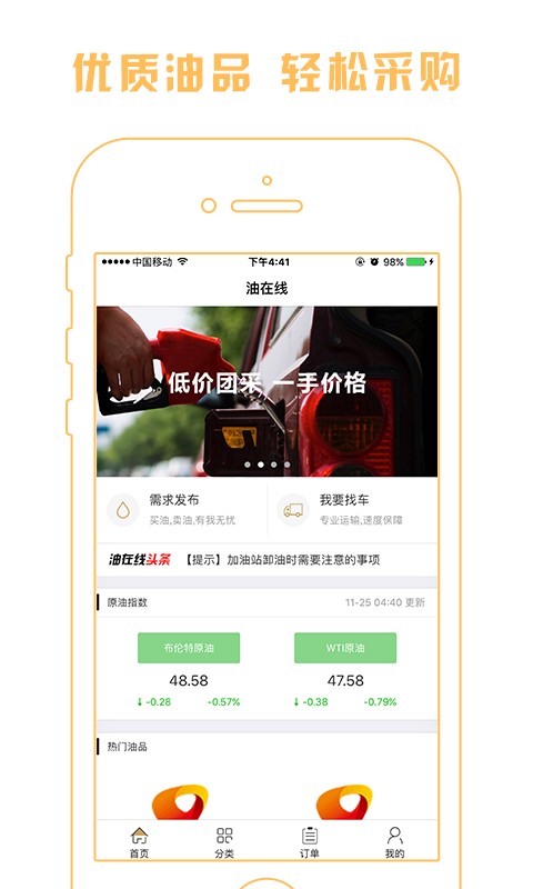 油在线app是油在线(大连)能源有限公司旗下电商购物平台,用户通过油在线app可以及时了解油品价格实时变化,随时随地轻松采购优质油品,享受品质购物体验。