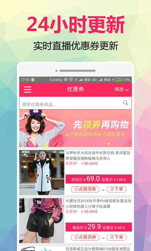 2、24小时实时更新直播,每日推荐10000+淘宝天猫品牌限量优惠券;