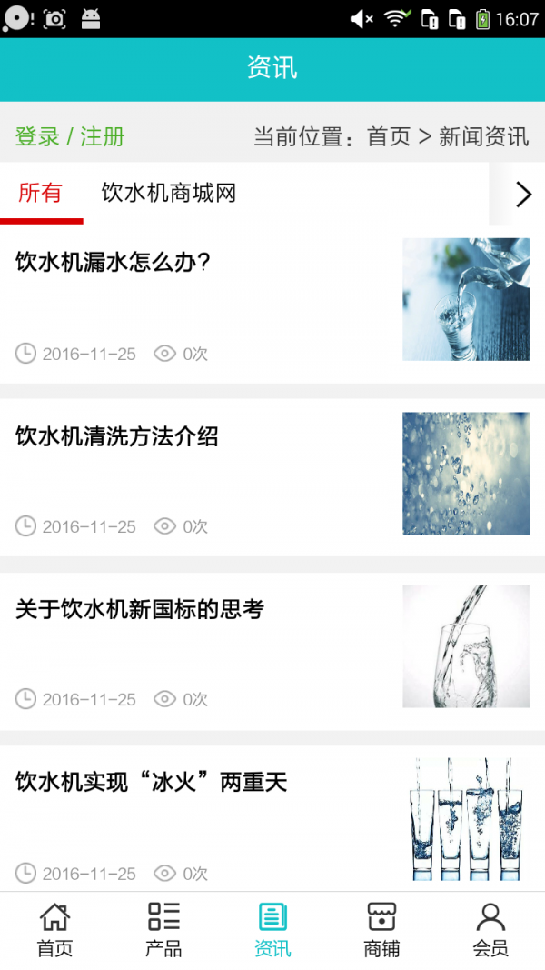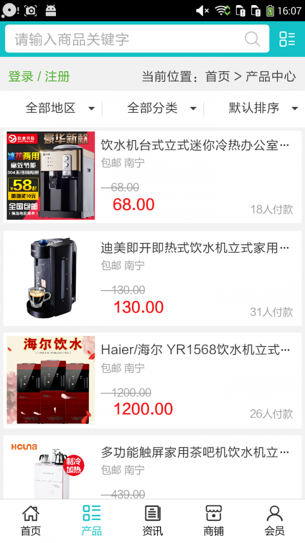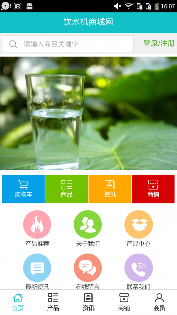 饮水机商城网app不仅具备购物、查询订单、搜索商品、行业资讯和产品评价等常用功能,而且还实现了手机版特有的会员注册登录、广告位、招商开店等功能。