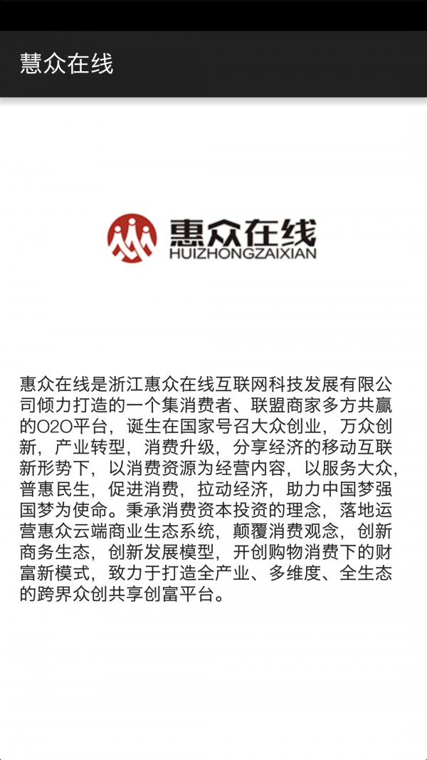 惠众在线是浙江惠众在线互联网科技发展有限公司倾力打造的一个集消费者、联盟商家多方共赢的o2o平台,诞生在国家号召大众创业,万众创新,产业转型,消费升级,分享经济的移动互联新形势下,以消费资源为经营内容,以服务大众,普惠民生,促进消费,拉动经济,助力中国梦强国梦为使命。秉承消费资本投资的理念,落地运营惠众云端商业生态系统,颠覆消费观念,创新商务生态,创新发展模型,开创购物消费下的财富新模式,致力于打造全产业、多维度、全生态的跨界众创共享创富平台。