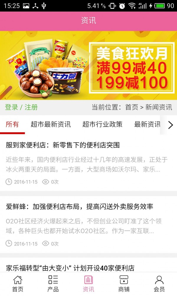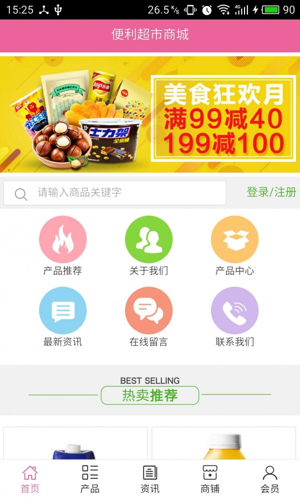 便利超市商城客户端不仅具备购物、查询订单、搜索商品、行业资讯和产品评价等常用功能,而且还实现了手机版特有的会员注册陆、广告位、招商开店等功能。