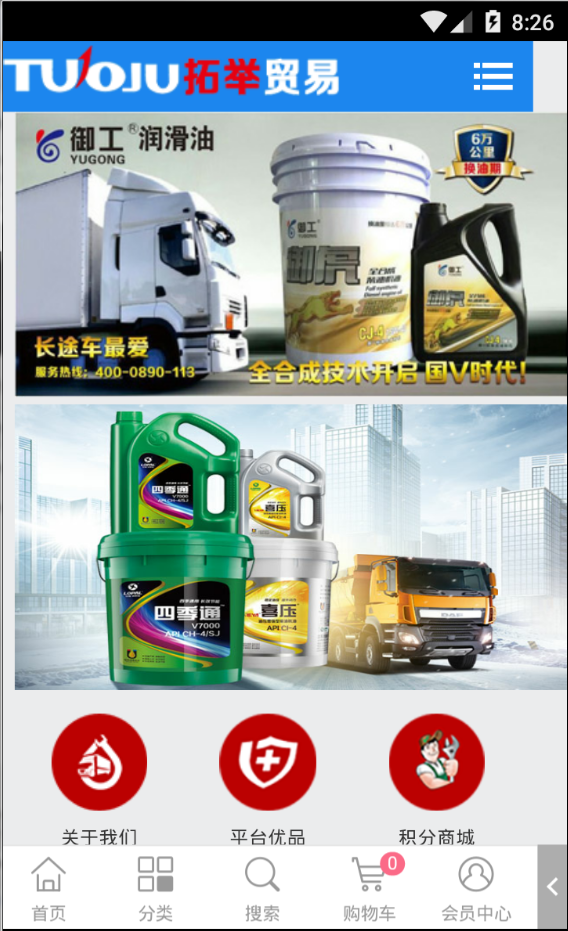 拓举贸易app是一款网络购物软件,拓举贸易app为用户打造一个汽车润滑油交易平台,方便用户了解更多汽车润滑油产品,为用户购物带来方便。