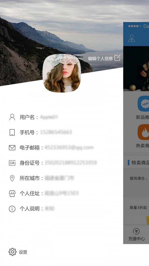 6、侧滑是个人信息的查看和编辑、设置。