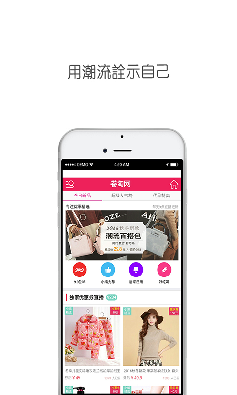 卷淘app是一款网络购物类应用,精选海量特色女装,方便用户随时在线购买,还可以全面掌握最新优惠活动信息,享受品质生活。