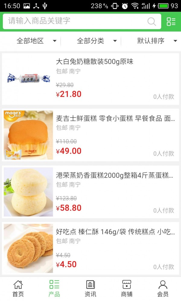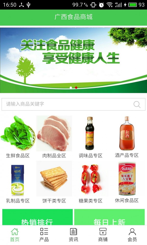 广西食品商城客户端不仅具备购物、查询订单、搜索商品、行业资讯和产品评价等 长用功能,而且还实现了手机版特有的会员注册登陆、广告位、招商开店等功能。