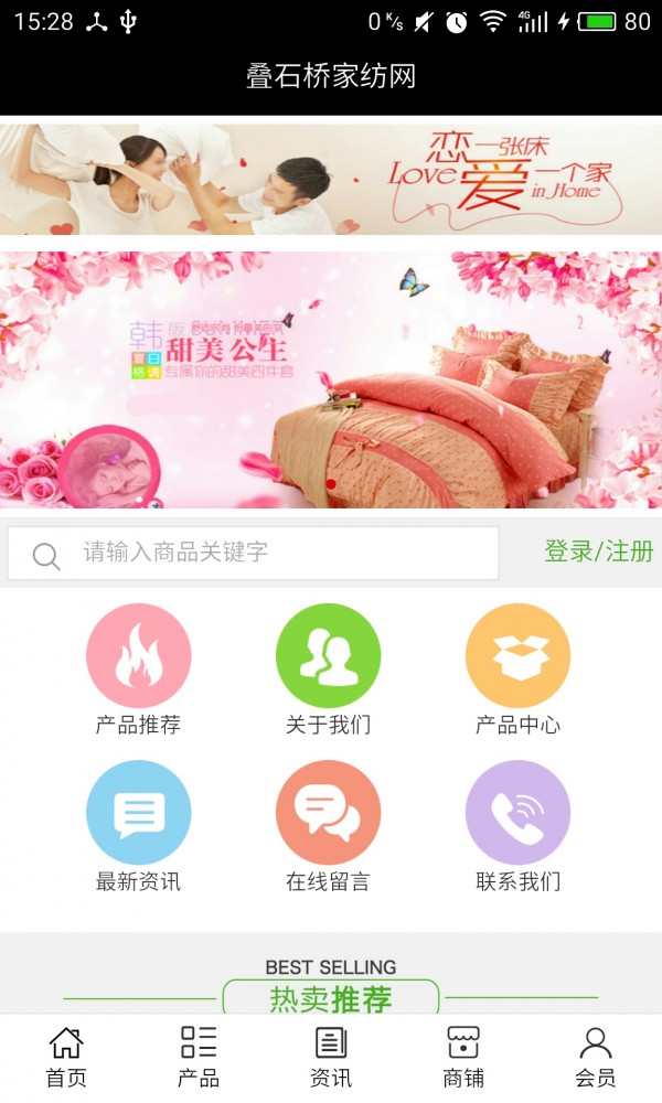 叠石桥家纺网APP不仅具备购物、查询订单、搜索商品、行业资讯和产品评价等 长用功能,而且还实现了手机版特有的会员注册登陆、广告位、招商开 店等功能。目标是整合当地品牌商、生产商、经销商,为商家和消费者 之间提供一站式解决方案。