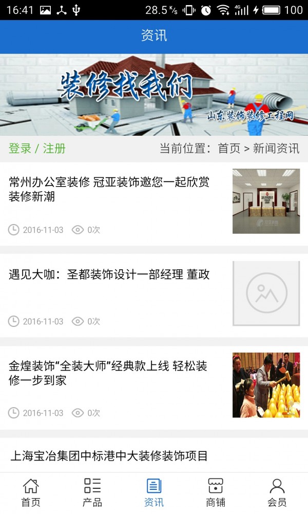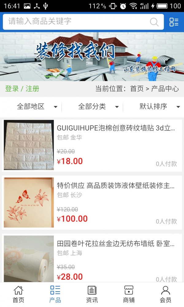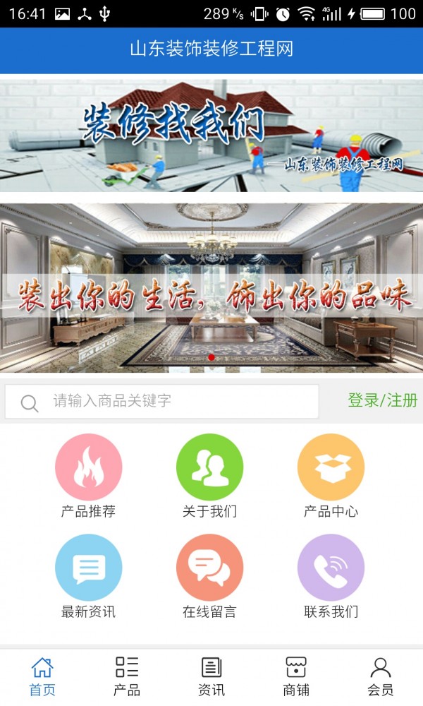 山东装饰装修工程网客户端不仅具备购物、查询订单、搜索商品、行业资讯和产品评价等常用功能,而且还实现了手机版特有的会员注册登陆、广告位、招商开店等功能。