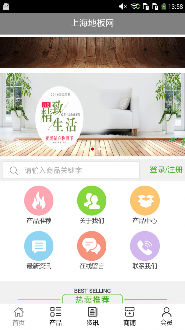 上海地板网客户端不仅具备购物、查询订单、搜索商品、行业资讯和产品评价等常用功能,而且还实现了手机版特有的会员注册登录、广告位、招商开店等功能。