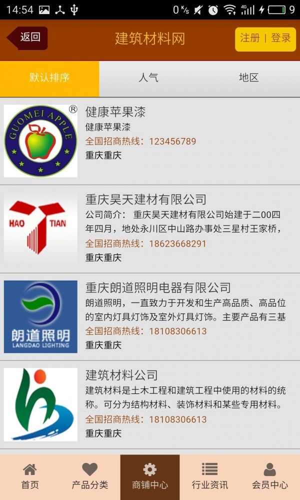 建筑材料网app不仅具备购物、查询订单、搜索商品、行业资讯和产品评价等常用功能,而且还实现了手机版特有的会员注册登陆、广告位、招商开店等功能。