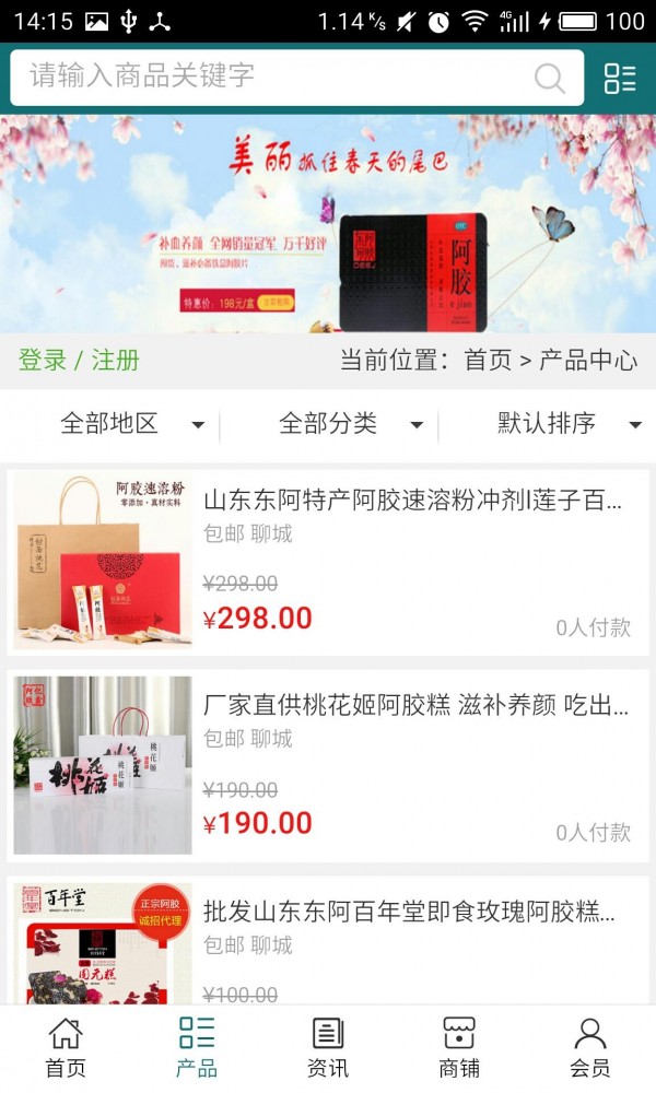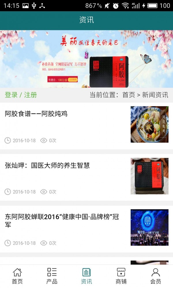 阿胶网app不仅具备购物、查询订单、搜索商品、行业资讯和产品评价等常用功能,而且还实现了手机版特有的会员注册登陆、广告位、招商开店等功能。